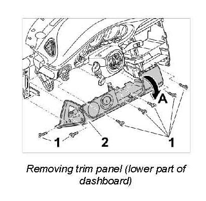 5. Remove trim panel (lower part of dashboard). Unscrew the fastening screws -1- and swivel the cover under the dashboard on the driver's side -2- downwards -Arrow A-.
