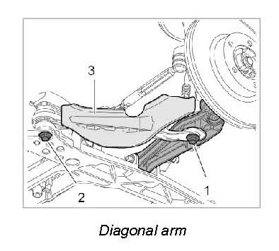 Loosen threaded joint -2- connecting diagonal arm to body through the opening (bore) in the underbody panel.