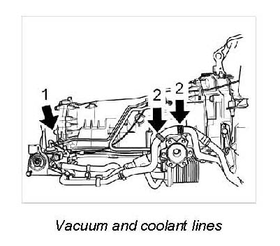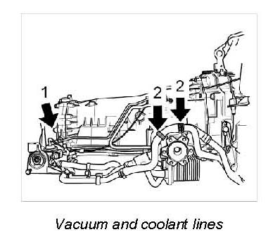 2. Unclip coolant lines from holders -2- on transmission.