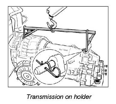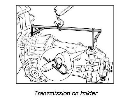 1. Fit holder 96740 on transmission, secure with cotter pin and suspend transmission on workshop crane.