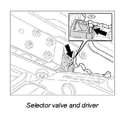 1. Insert electrohydraulic control unit into the transmission from below. The selector valve must engage in the driver of the notched plate.