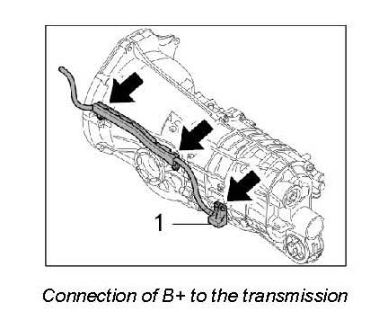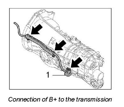 3. Fit the electric cable (positive lead). Do this by fitting the holder on the transmission -arrows- and connecting cables in the B-Plus box -1-.