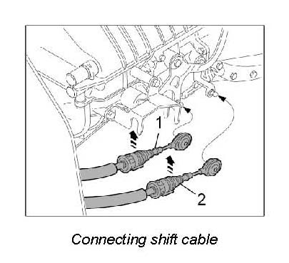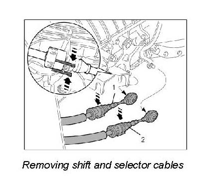 5. Disconnect shift -1- and selection cables -2- from the transmission.