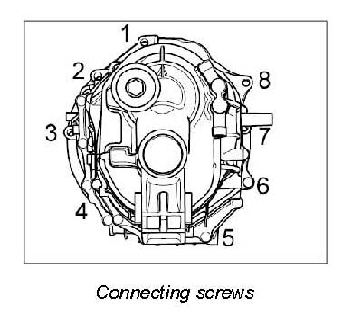 5. Unscrew fastening screws (8) between engine and transmission.