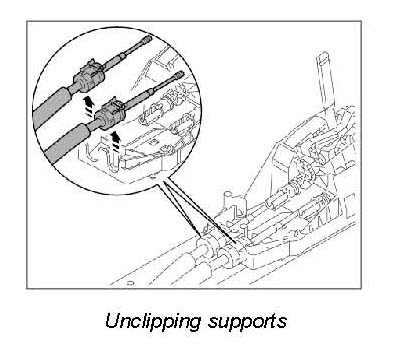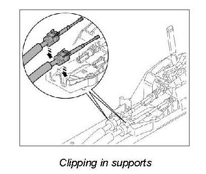 3. Clip in supports on the gearshift bracket. The support with the blue hinged tube must be fitted on the left and the support with the black hinged tube must be fitted on the right.