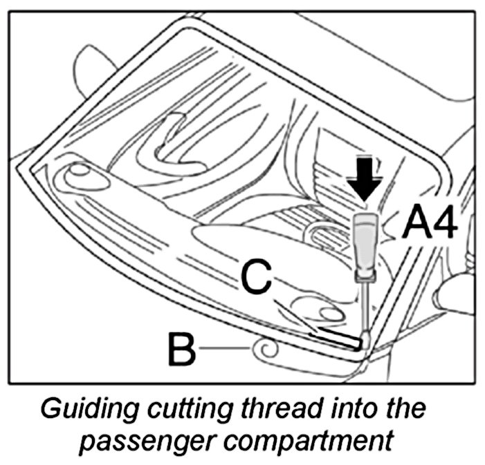 3. Pull cutting thread -B- into the passenger compartment.