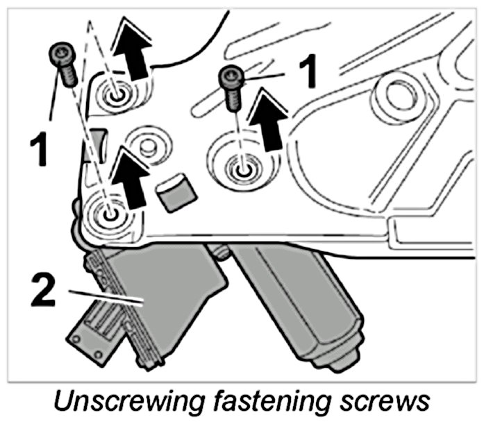 1. Unscrew the three fastening screws -1- on the rear power window motor -2-.