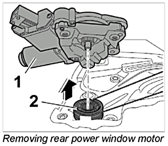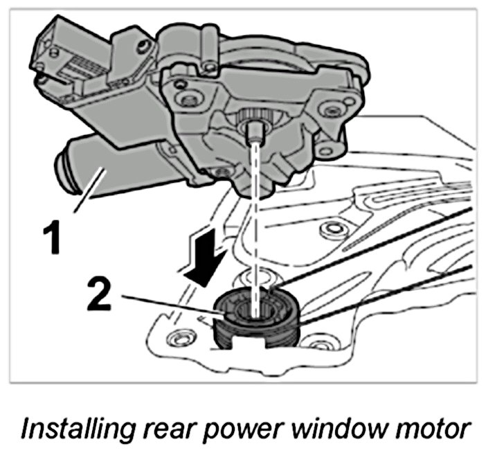 1. Position rear power window motor -1- and insert it into the teeth -2-.