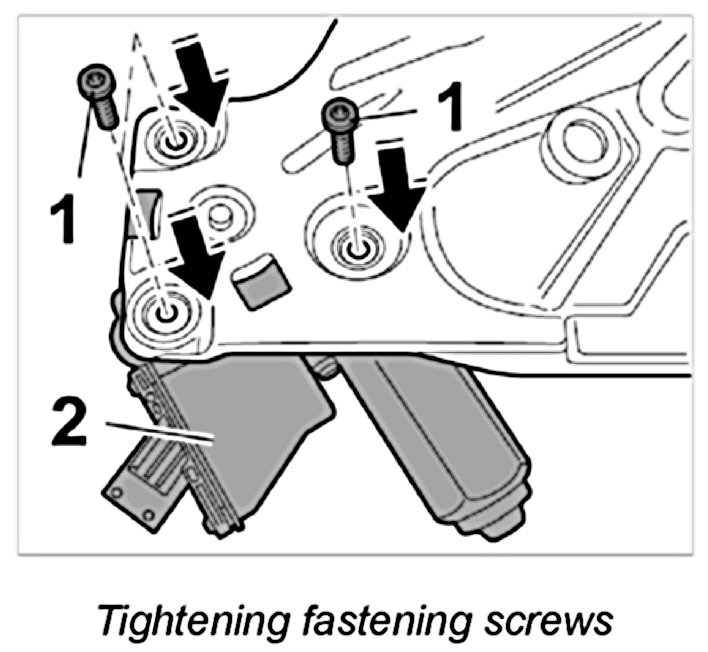 2. Fasten the rear power window motor -2- with the three fastening screws -1-. -] Tightening torque: 3 Nm (2.0 ftlb.)
