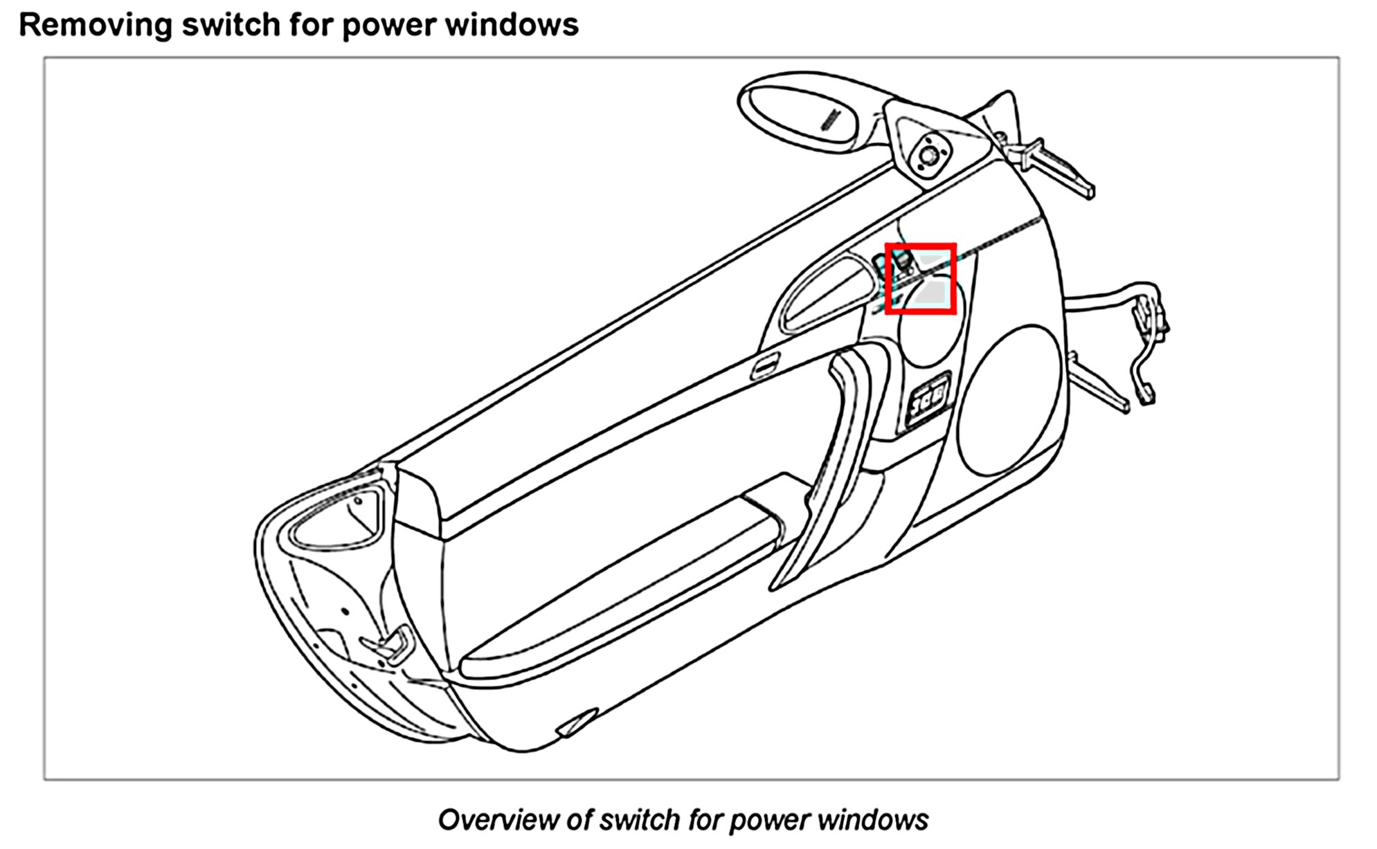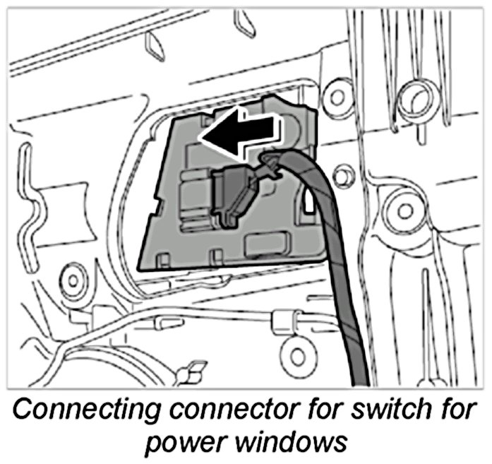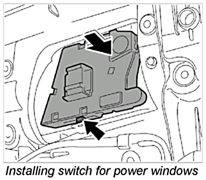 1. Insert the switch for power windows into the mounting points at the door trim panel using the locking tabs.