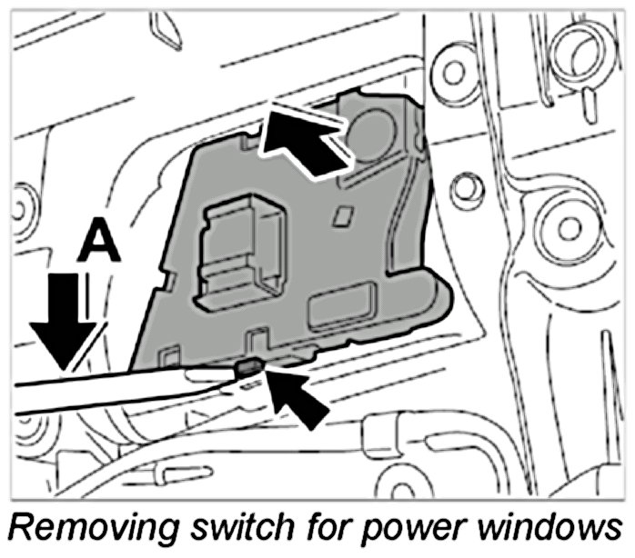 2. Lever off switch for power windows at the locking tab -arrow- (-arrow A-) and remove it.