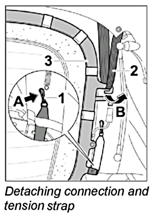 2.2. Disengage tension strap -2- from the frame of the rear window -3 - at the left and right -arrow B-.