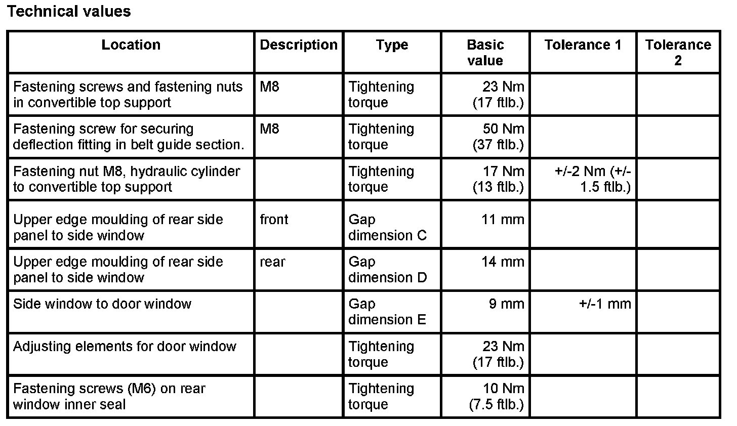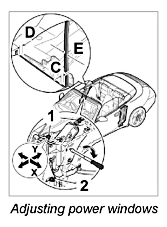 NOTE: By moving the window lifter with respect to the longitudinal axis of the vehicle, the power windows can be adjusted by dimension -Y = ± 10 mm- . The contact pressure of the upper edge of the side window on the convertible top is adjusted by screwing the adjusting element in or out by dimension -X = ± 10 mm- . The contact pressure on the rear window inner seal or the offset from the door window is adjusted by screwing both of the upper adjusting elements in or out by dimension -X = ± 5 mm-.