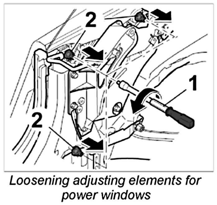 6. Release adjusting elements for power windows with the adjustment tool -1- adjustment tool for rear window NR.123-1. To do this, loosen and unscrew the nuts -2- on the adjusting elements (-arrows-).