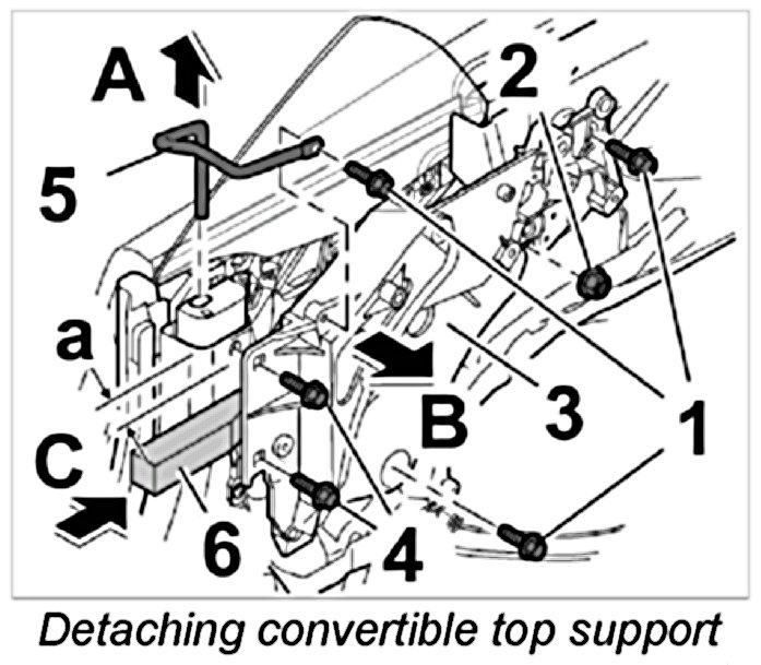 7. Remove fastening screws -1- and fastening nuts -2- from the convertible top support -3-. Remove fastening screws -4- for securing the deflection fitting -5- in the belt guide section. Pull deflection fitting -5- up out of the belt guide section. -arrow A- Pull convertible top support -3- inwards (-arrow B-) and fix a spacing block -6- measuring -dimension a = 30 mm- between B-pillar and convertible top support -arrow C-.