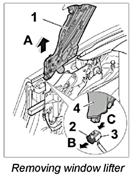 NOTE: Removal and installation of the rear window lifter should be carried out with the side window. Otherwise adjustment work is hindered during installation.