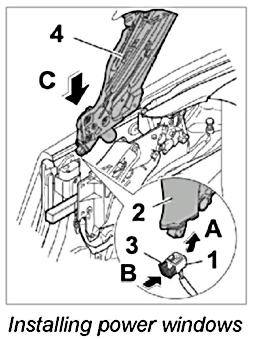 2. Guide window lifter -4- into the window shaft from above -arrow C- and position in the mounts in the inner side section.