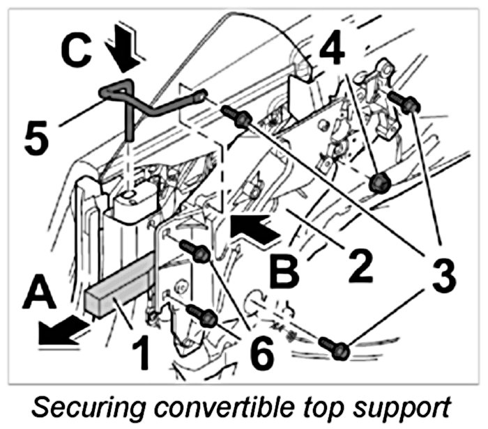 3. Remove spacing block -1- between B-pillar and convertible top support -2- (-arrow A-). Position convertible top support -2- (-arrow B-). Position and tighten fastening screws -3- and fastening nuts -4- in convertible-top support -2-. -] Tightening torque: 23 Nm (17 ftlb.)