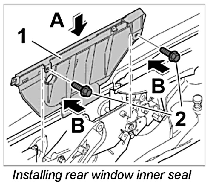 1. Undo front and rear fastening screws -1- from the convertible top support and the belt guide section -arrows A- , and pull rear window inner seal -2- up and out -arrow B-.