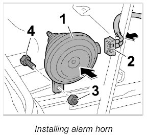 1. Position alarm horn -1-. Insert and counter fastening screw -4- and tighten fastening nut -3-. - Tightening torque: 10 Nm (7.5 ftlb.)