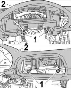2. Unscrew fastening screws -1- on the instrument panel -2- close to the outer air ducts.