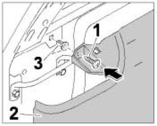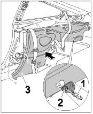 5. Pull side trim panel locking tabs -3- out of the clamp in the rear side panel. Lift side trim panel locking tabs on lower side member and guide them out.