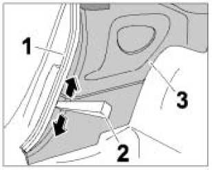 6. Lift up the pillar seal -1- using a plastic spatula -2- along the side trim panel -3-.