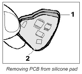 2. Remove silicone pad -1- with PCB from the remote control housing.