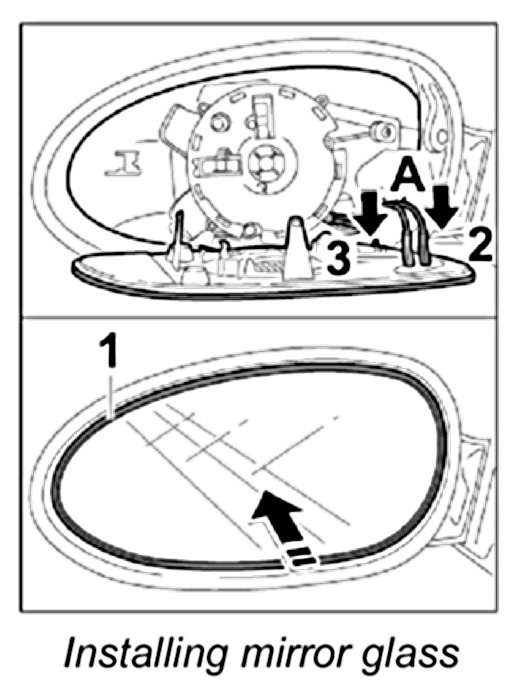 3. Press in centre of mirror glass -Arrow- until the glass engages securely in the adjustment mechanism.