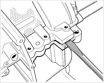 57. Unscrew 13 M6 x 20 Torx screws on the oil pan cover. Tap cover gently on the sides using a plastic hammer, then carefully lift it at the leverage bar -see figure- using a plastic-coated mounting lever and remove the oil pan.