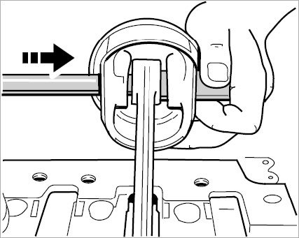 23. Coat bucket tappets with fresh engine oil and insert into the fitted bores in the bucket tappet housing (switching tappet with dowel pin on the inlet side).