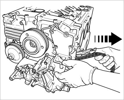 15.3. Pull timing chain 4-6 outward so that the intermediate shaft is centered. Align driver for the oil pump and then push the housing together with the oil pump into the bearing seat.