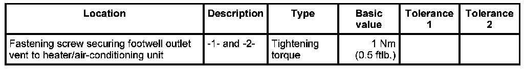 2. Screw the footwell outlet vent to the heater/air-conditioning unit with the two fastening screws at the left -1- and right -2-. - Tightening torque: 1 Nm (0.5 ftlb.)