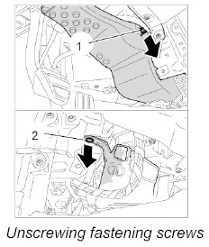 1. Unscrew the fastening screw at the left -1- and right -2- of the heater/air-conditioning unit.