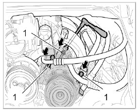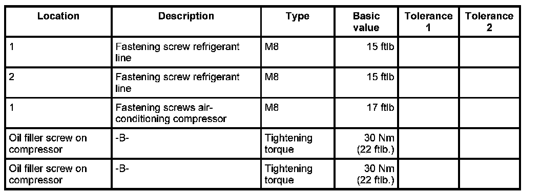 6. Place the air-conditioning compressor with the rear fastening screw on the engine housing and screw down with the three fastening screws -1-. - M8: 17 ftlb