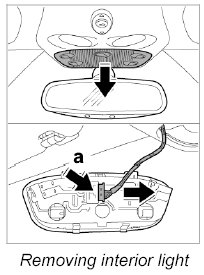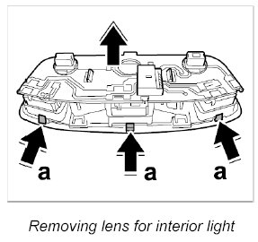 1. Carefully release lens at the three locking lugs on the interior light -arrow a- and remove interior light.