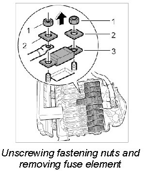 2. Unscrew the fastening nuts on the faulty fuse element -1-, remove the washer -2- and take out the fuse element -3-.