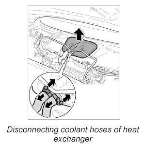 1. Release the two top fastening clamps for the coolant hoses of the heat exchanger and slide them back over the hoses.
