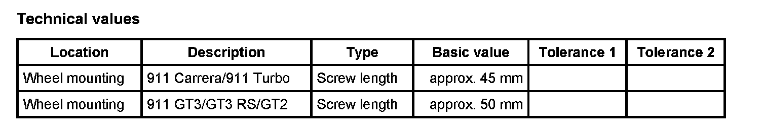The wheels on the 911 Carrera (997) and 911 Turbo (997) are secured using the same standard wheel bolts -A- (M14 x 1.5) as are used on the 911 Carrera (996). Length: dimension -X- - Screw length: approx. 45 mm.