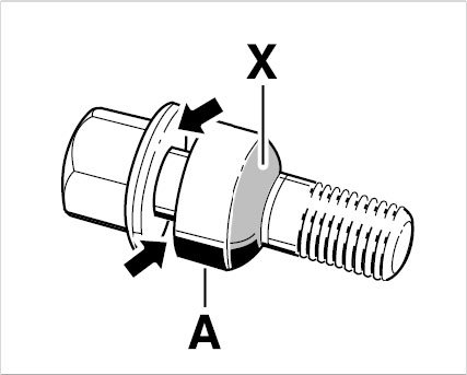 3. Always apply a thin coat of Optimoly TA (aluminum paste) on the thread of the wheel bolts, on the shank and between the bolt head bearing surface and spherical cap ring (under the head) -arrows-. The spherical cap bearing surface -X- of the wheel bolts that face the wheel must not be greased.