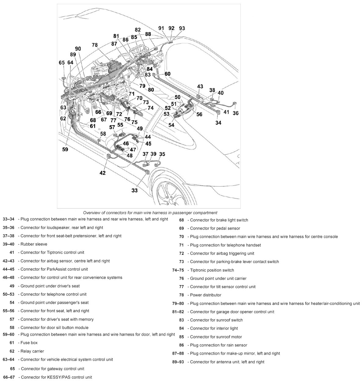 21. Push together plug connection between main wire harness and wire harness for door at the left and right -59 and 60- until they engage securely.