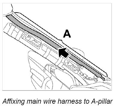 9. Remove protective film of adhesive strip on main wire harness -area A- and affix main wire harness to A - pillar.