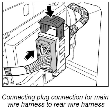32. Connect plug connection between main wire harness and rear wire harness at the left and right -33 and 34- and lock it.