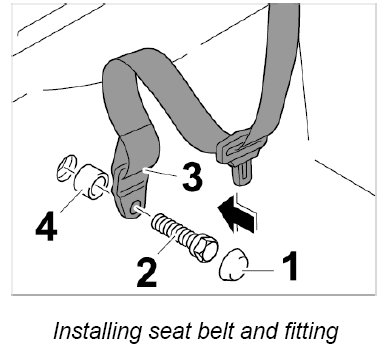 3.1. Tighten fastening screw -2-, seat belt with fitting -3- and spacer sleeve -4- on inner lower side member. - Tightening torque: 50 Nm (37 ftlb.).