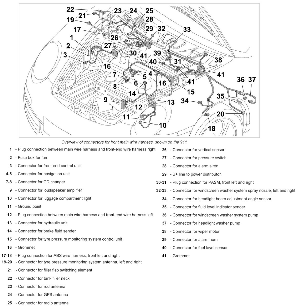 21. Push on connectors of front antenna for tyre pressure monitoring system -19 and 20- at left and right until they are felt to engage.