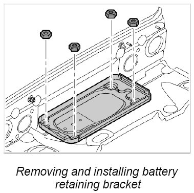 5. Position battery retaining bracket and secure with the four fastening nuts. - Tightening torque: 10 Nm (7.5 ftlb.).