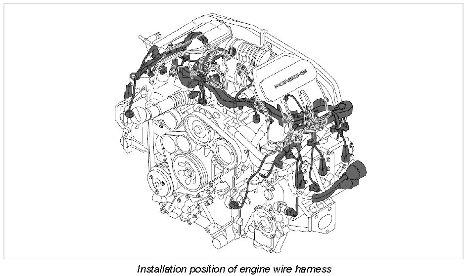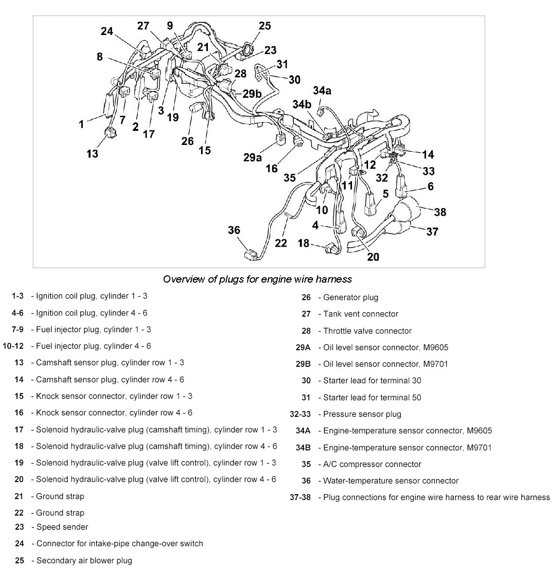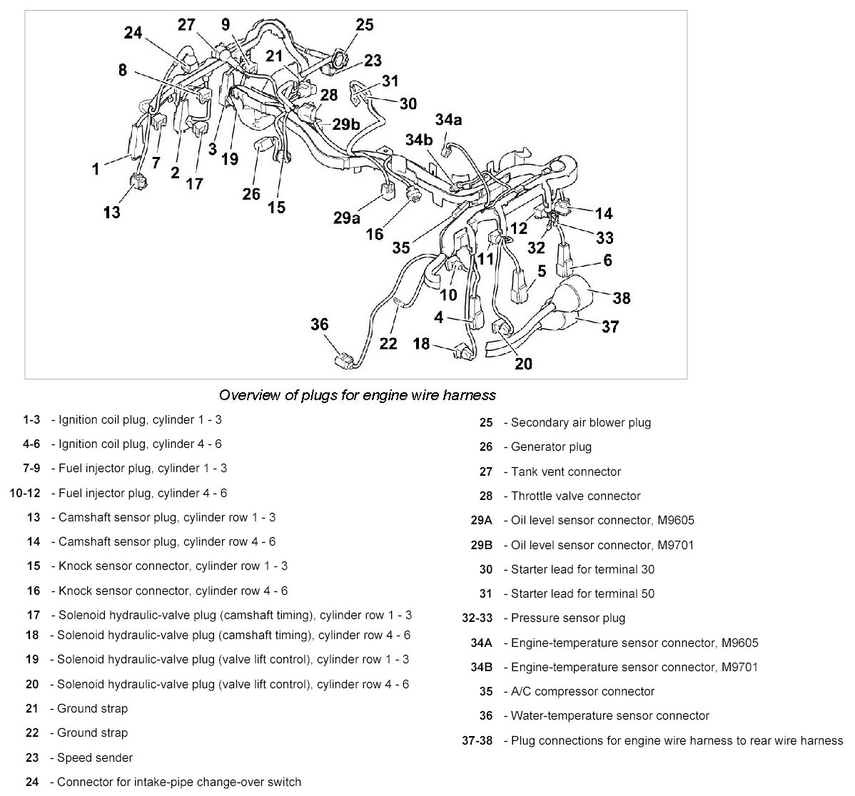 5. Push plug connection for engine wire harness to rear wire harness -37 and 38- together.