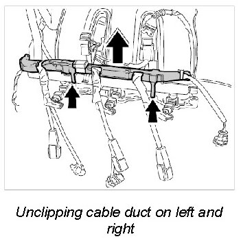 18.1. Unclip cable duct on the left and right at the fuel distributor pipes -Arrows-.