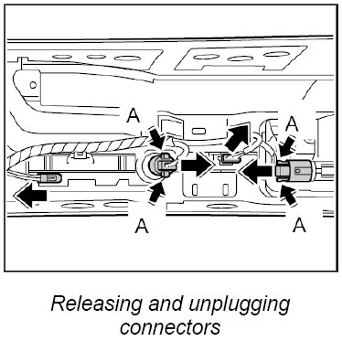 1. Release electric connectors for the equipment versions (e.g. cigarette lighter, interior sensor etc. -A- and unplug.