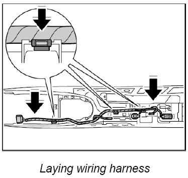 1. Lay wiring harness with retaining clips in centre console and push on retaining clips at the points provided.